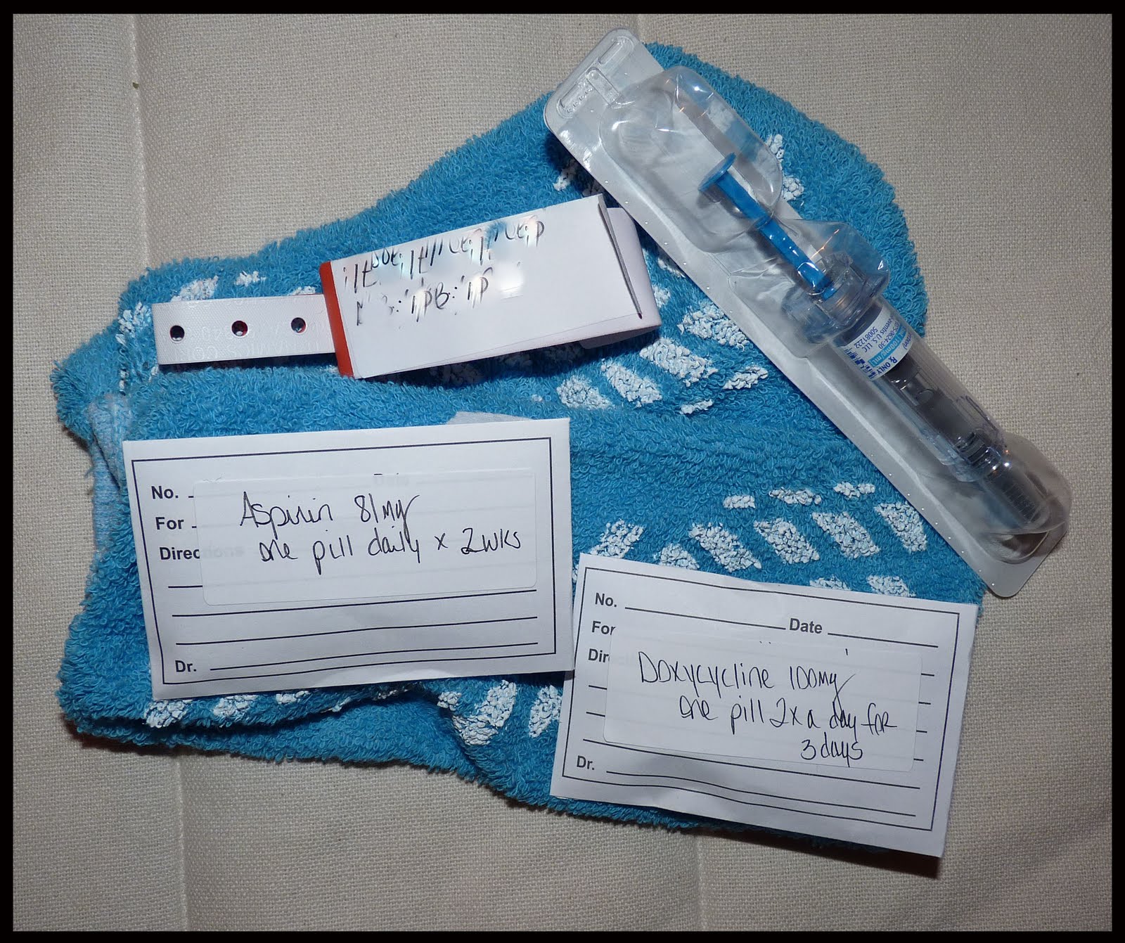 I was set up with some baby aspirin, a antibiotic and an additional shot (to prevent blood clots). I kept the non skid socks too. No idea why, I might be a hoarder. They don’t reuse them, and I didn’t want to toss them.