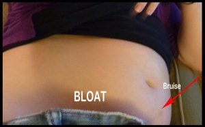 When we arrived home the FM wanted to take some shots of me on the couch. I was under a blanket in no time. We chatted on camera for a few minutes, then I slept for hours. I felt bloated and sore at this point, I felt like I was kicked in the ovaries by a large man in steel toe boots. I couldn’t sit, I couldn’t get up my stairs and I couldn’t get off the toilet. Thank goodness for the BF. Thank goodness the FM wasn’t around for that. We can leave certain things to the imagination. I won’t leave my bloated belly to the imagination. I’ve posted a picture of it. (my tummy is not this gross normally)